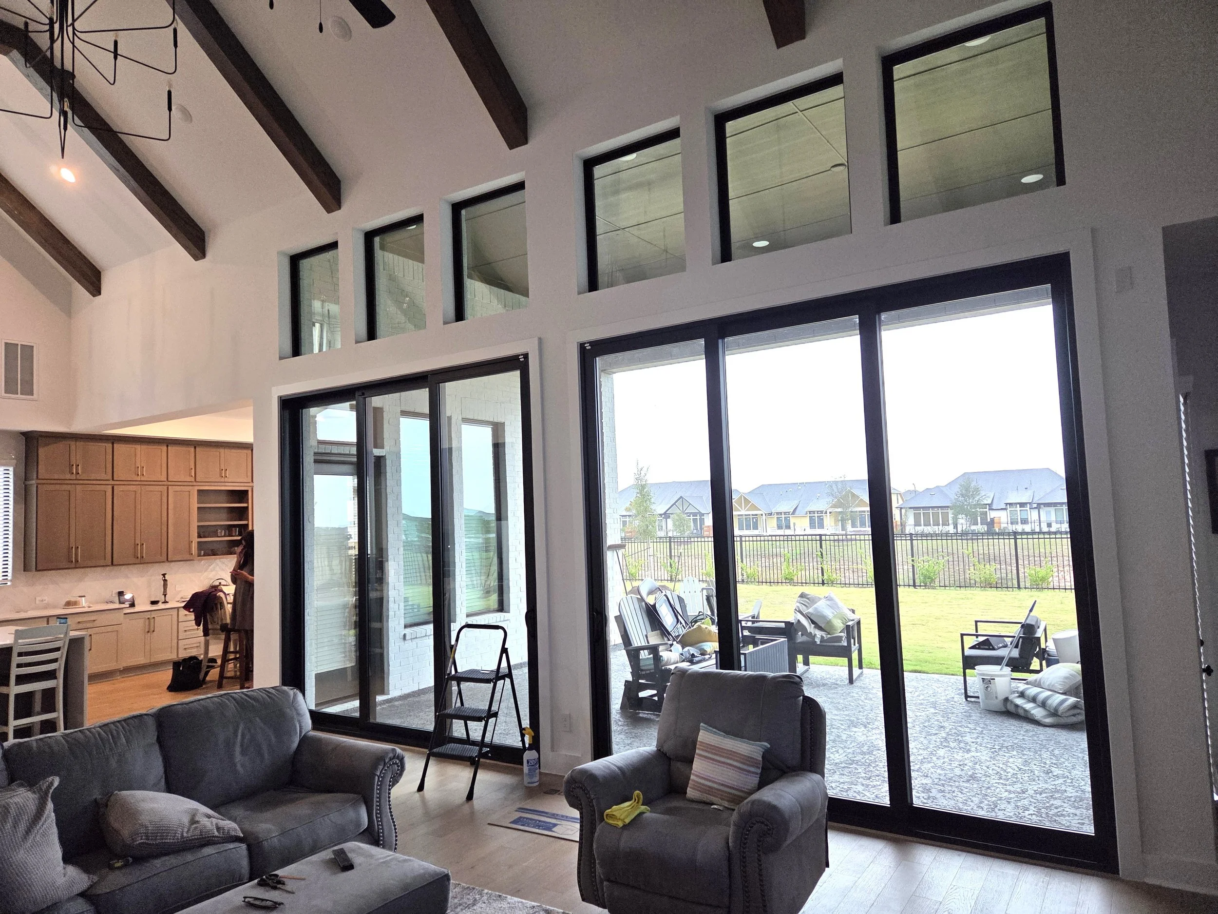 In this open-concept living and kitchen space, the homeowners wanted to maintain their outdoor views while adding privacy—especially in the evenings. Custom linen drapery panels with a light-filtering lining were installed on traversing rods, allowing flexible coverage across both sliding doors. The result is a soft, layered look that diffuses light during the day and provides privacy at night while complementing the home’s warm, modern farmhouse design.